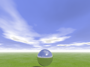 | Le monde vu de l'intérieur d'une hémisphère du type "cloche à fromage" avec un brouillard réaliste à l'horizon fait avec une "color_map{gradient <0,1,0> ..." tirant la couleur bleu foncé au zénith à blanc au niveau d'horizon. Le tout agrandi par "scale 10000".