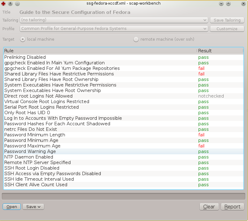 Here we again evaluate XCCDF benchmark via oscap tool, use common as profile, ssg-fedora-cpe-dictionary.xml to specify that only rules applicable to Fedora product should be checked, and evaluate ssg-fedora-xccdf.xml benchmark file.
