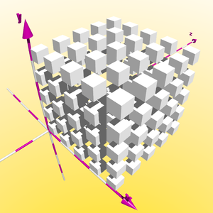 Il est posibble d'imbriquer une boucle dans une boucle additionnelle imbriquée, faisant un pas de la valeur y = 0 à y = +5. Avec ceci, nous obtenons une boîte constituée par les objets identiquement formés